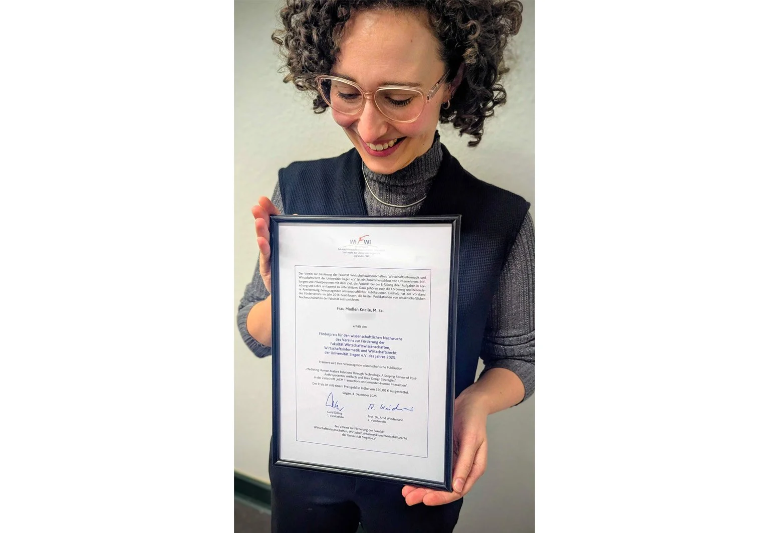 Herzlichen Dank an den Verein zur Förderung der Fakultät Wirtschaftswissenschaften, Wirtschaftsinformatik und Wirtschaftsrecht der Uni Siegen e.V. für die Auszeichnung! Außerdem allen voran an die Co-Autor:innen der Arbeit: Judith Dörrenbächer, Marc Hassenzahl und Matthias Laschke. Und herzlichen Glückwunsch an die weiteren Preisträger:innen!